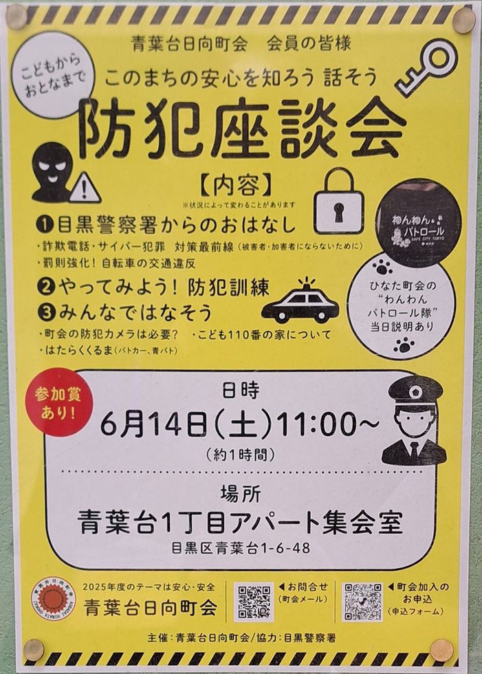 青葉台日向町会にて、目黒警察署ふれあいポリス浮田さんより防犯に関してのお話をお伺いしてきました。
